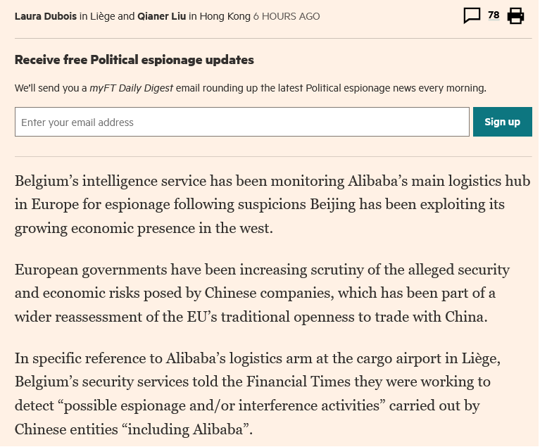 Alibaba accused of ‘possible espionage’ at European hubBelgian security service says Chinese group’s logistics arm in Liège under scrutiny over use of sensitive data Oct 05, 2023∙ PaidShareThis post is for paid subscribersAlready a paid subscriber? Sign in