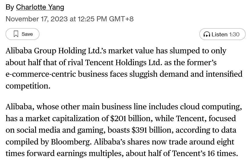 Alibaba Is Worth About Half of Tencent as Demand Recovery LagsNov 17, 2023∙ Paid1ShareCompanies’ values widen after Alibaba cloud announcementAlibaba now trades at eight times forward earnings multiplesThis post is for paid subscribersAlready a paid subscriber? Sign in