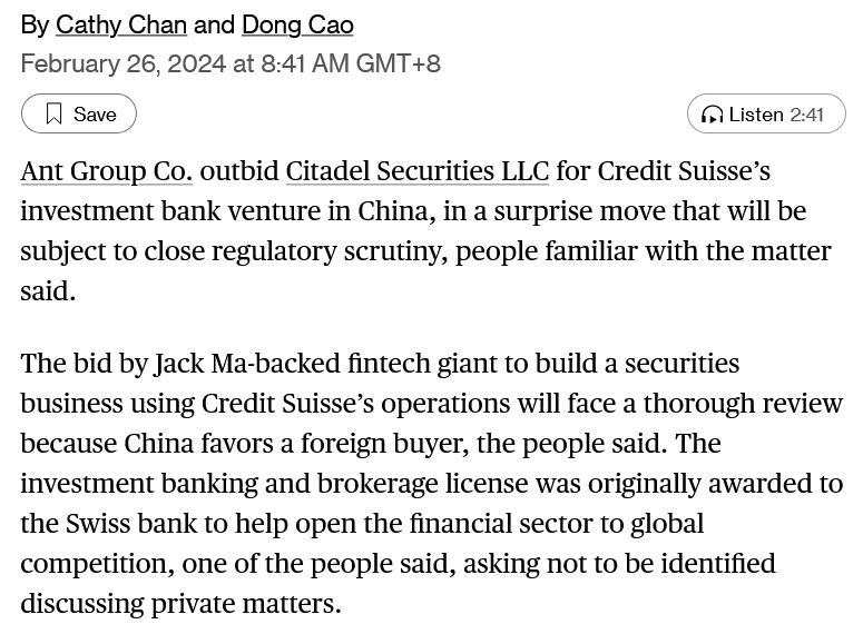 Ant Outbids Citadel Securities for Credit Suisse’s China UnitFeb 26, 2024∙ PaidShareJack Ma-backed fintech giant said to seek securities operationDeal faces regulatory scrutiny as China prefers foreign buyerThis post is for paid subscribersAlready a paid subscriber? Sign in