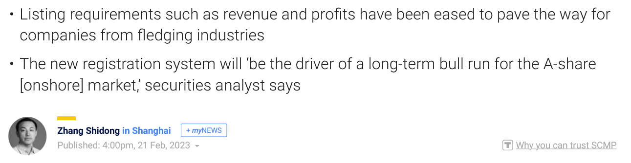 China’s new IPO rules will attract listings by fast-growing tech companies, spark bull run in stocks, analysts say Feb 21, 2023∙ PaidShareThis post is for paid subscribersAlready a paid subscriber? Sign in