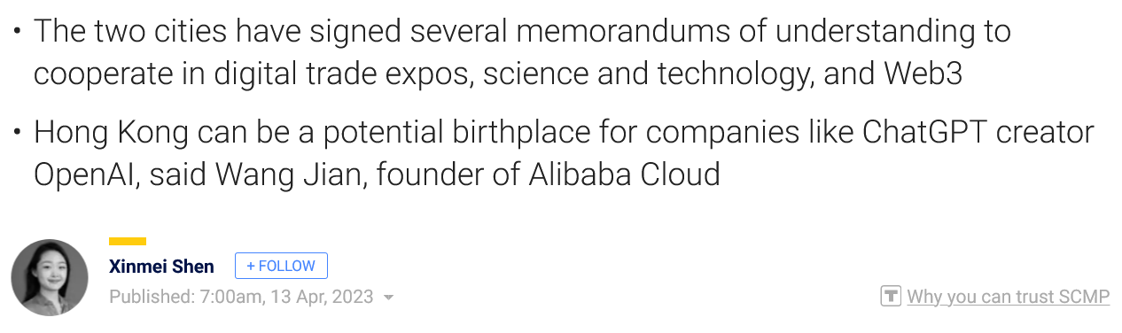 Hong Kong and Alibaba’s hometown Hangzhou sign MOUs to cooperate in digital trade, Web3 Apr 13, 2023∙ PaidShareThis post is for paid subscribersAlready a paid subscriber? Sign in