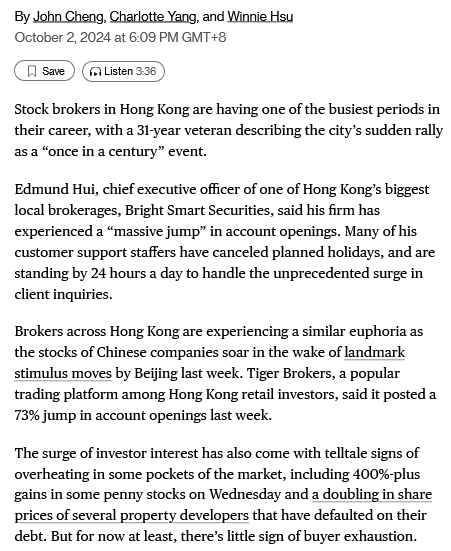 Hong Kong Brokers Swamped by ‘Once In a Century’ Stock FrenzyOct 02, 2024∙ Paid1ShareHang Seng Index has its best day in almost two yearsMarket participants cancel holidays as frenzy picks up paceThis post is for paid subscribersAlready a paid subscriber? Sign in