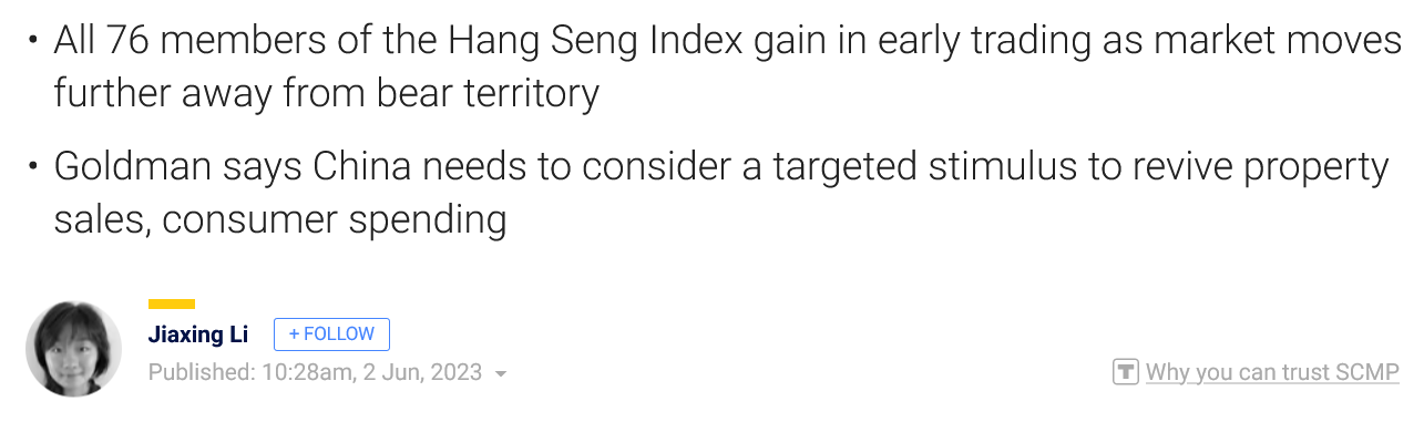 Hong Kong stocks log biggest gain in 3 months as Tencent, Alibaba, Longfor surge on stimulus bets while BYD gains on record EV sales Jun 02, 2023∙ Paid1ShareThis post is for paid subscribersAlready a paid subscriber? Sign in