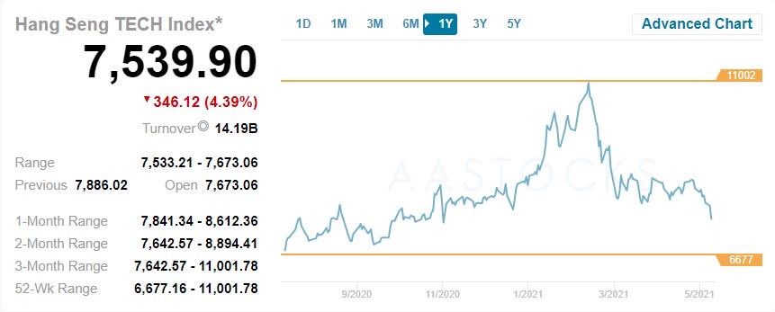 HS Tech Index Crashes over 4% todayMay 11, 2021∙ PaidShareHS tech index peaked at 11,000 level early this year, it has since fallen 3460 to 7540 level now, a crash of 32% from peak! Its not common to see such a big drop, it doesn’t happen yearly… a 10% corr…This post is for paid subscribersAlready a paid subscriber? Sign in