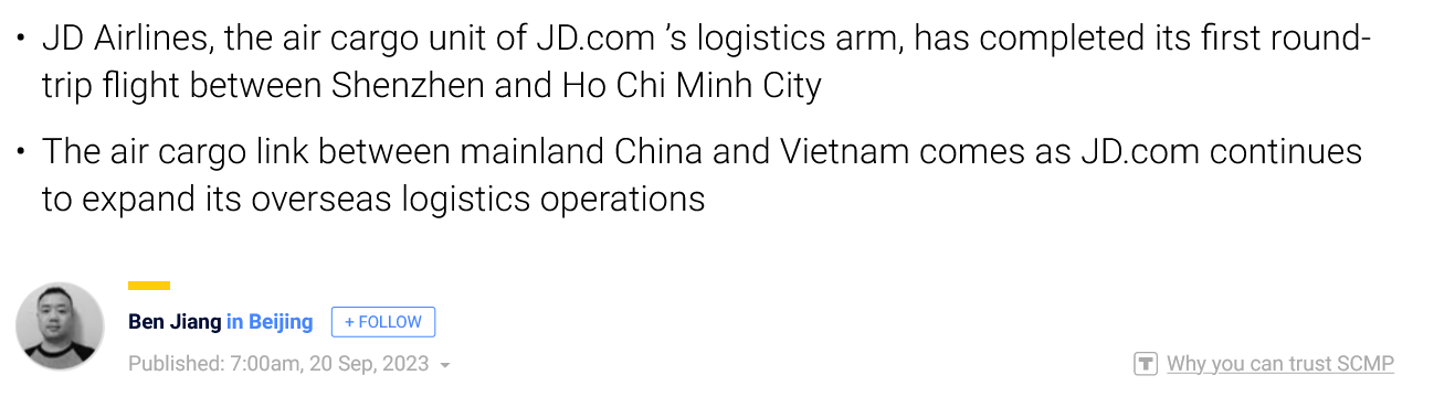 JD.com air cargo unit launches route to Vietnam as it ramps up overseas expansionSep 20, 2023∙ PaidShareThis post is for paid subscribersAlready a paid subscriber? Sign in