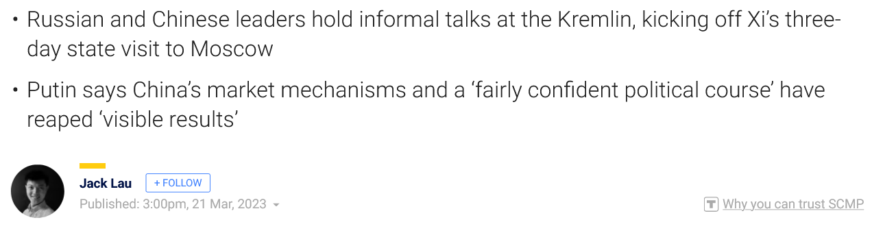 Putin tells Xi that Russia is ‘a bit envious’ of China’s economic development Mar 21, 2023∙ Paid1ShareThis post is for paid subscribersAlready a paid subscriber? Sign in