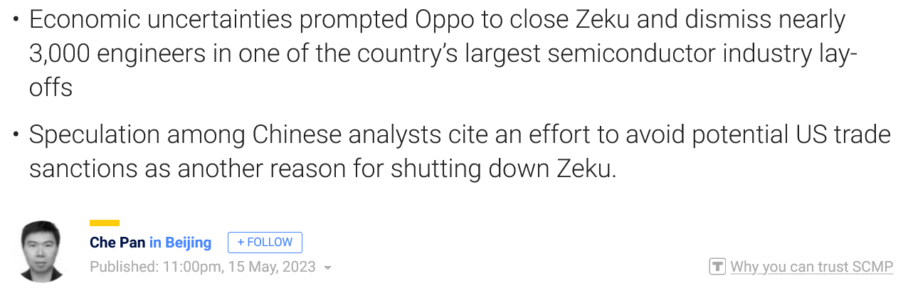 Smartphone giant Oppo’s closure of chip design unit Zeku triggers speculation on cause of action, as 3,000 engineers are laid off May 16, 2023∙ PaidShareThis post is for paid subscribersAlready a paid subscriber? Sign in