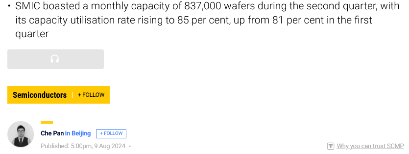 Tech war: China’s SMIC reports strong revenue growth as geopolitical tensions spur local demandAug 09, 2024∙ PaidShareThis post is for paid subscribersAlready a paid subscriber? Sign in