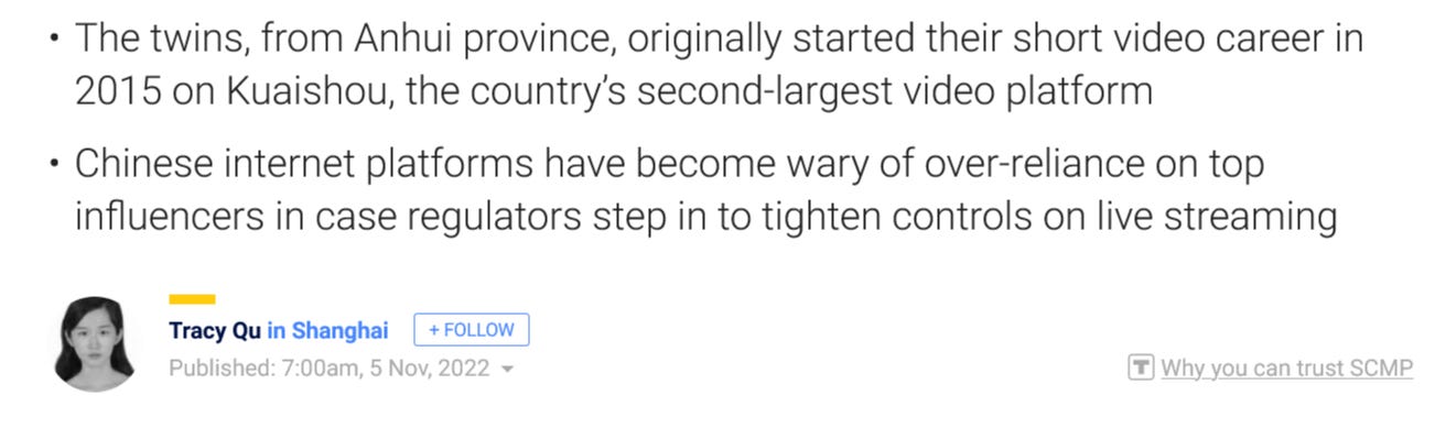 The top influencers on China’s version of TikTok are twin brothers with over 100 million followers Nov 05, 2022∙ Paid2ShareThis post is for paid subscribersAlready a paid subscriber? Sign in
